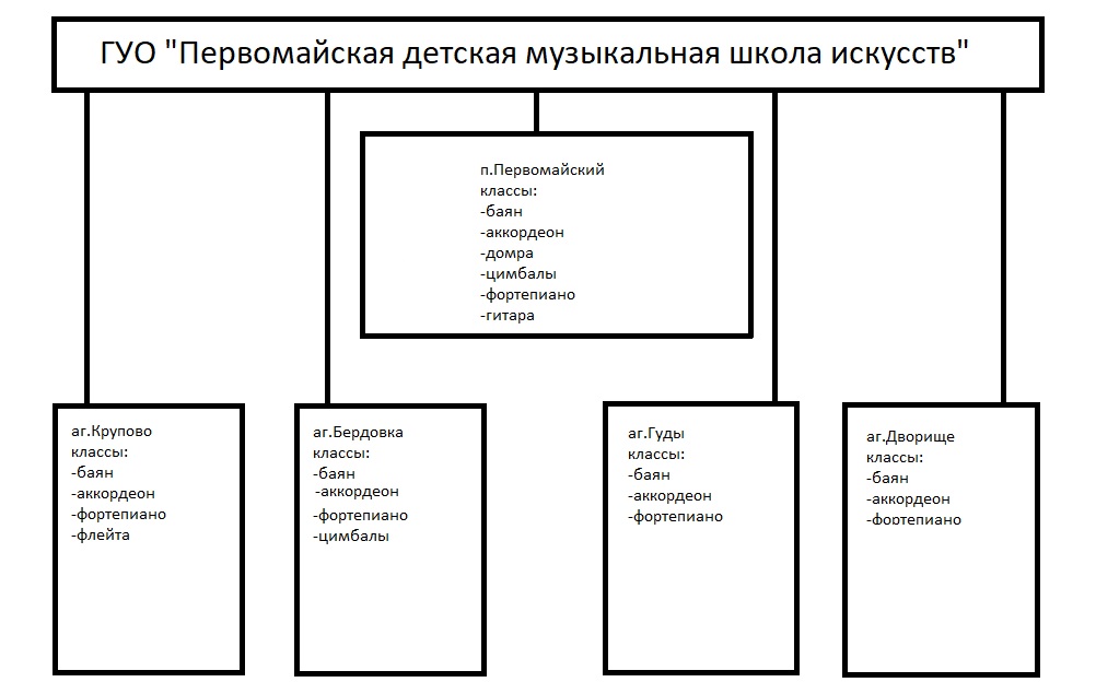 В разные годы к Первомайской музыкальной школе относились филиалы в д. Стерково, д. Тарново, д. Белица. В настоящее время к школе относятся филиалы в д. Бердовка, д. Дворищи, д. Гуды и д. Крупово.
