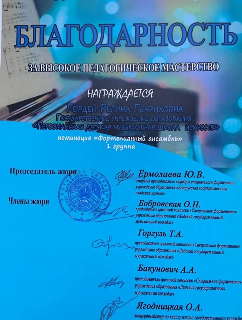 Благодарность вручена учителю Р.Г.Гордей.